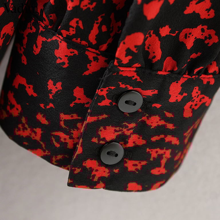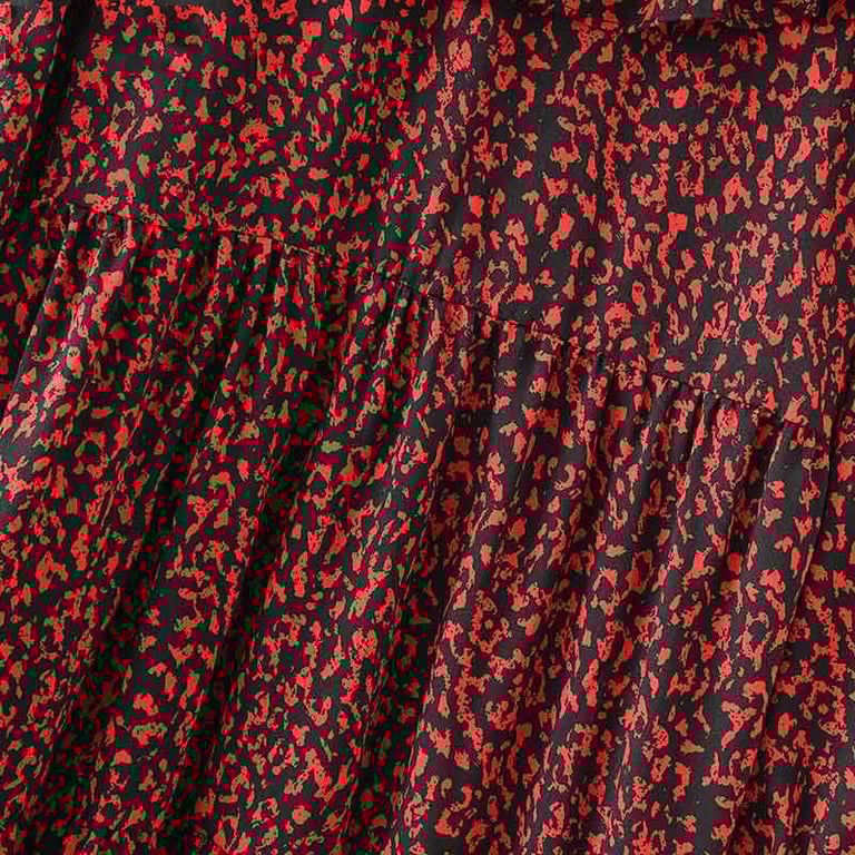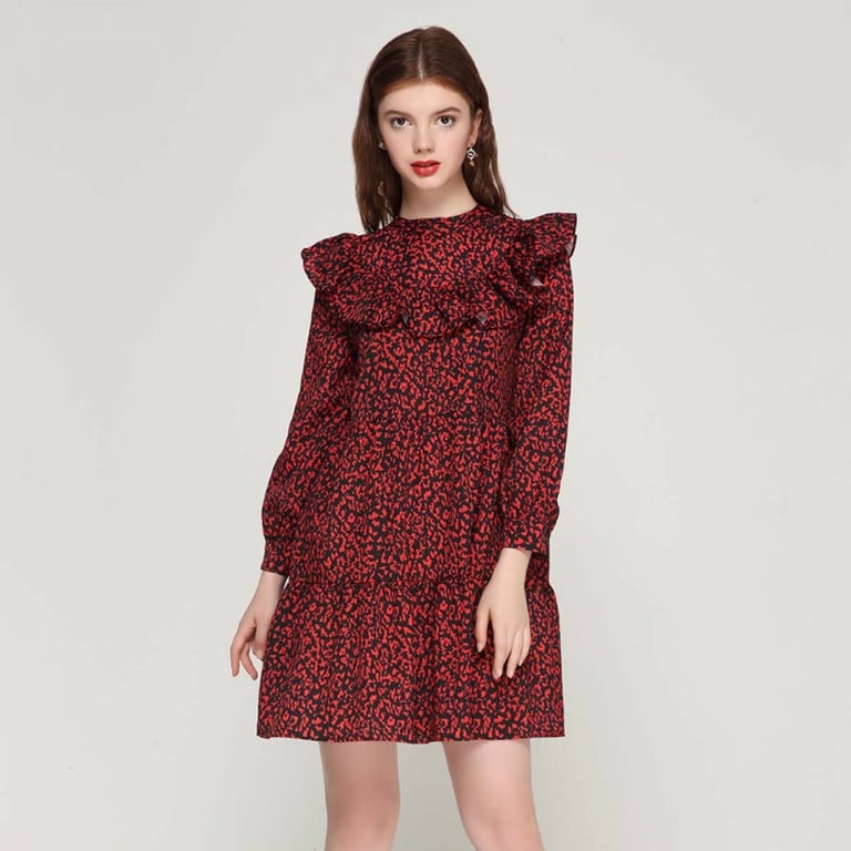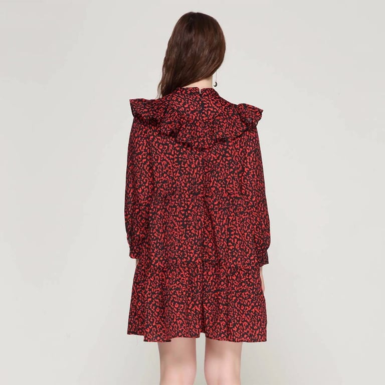 Damenkleid mit langen Ärmeln. Bequemer, lockerer Schnitt mit einer Länge über dem Knie, mit Volants und einem Tiermuster.