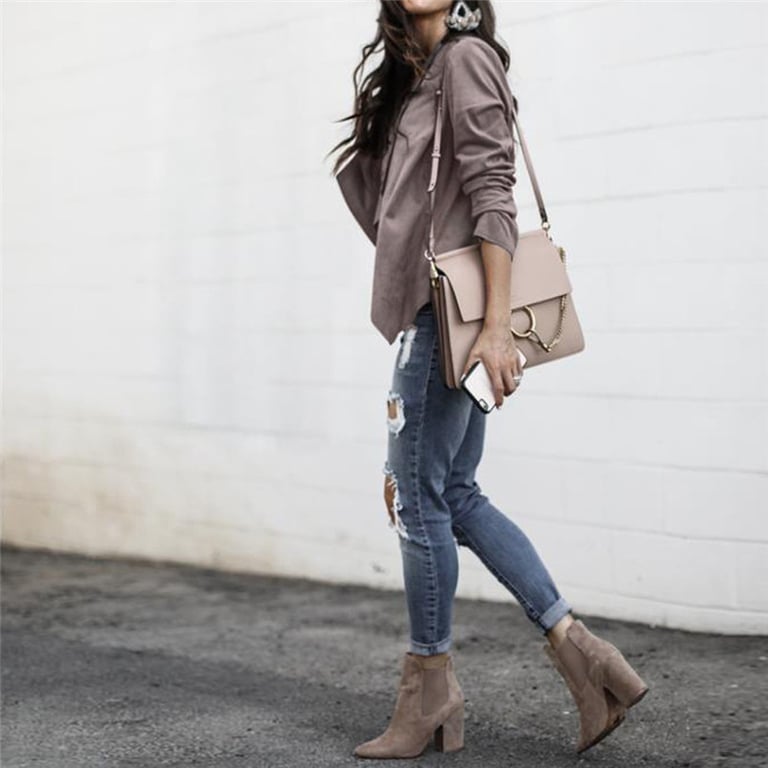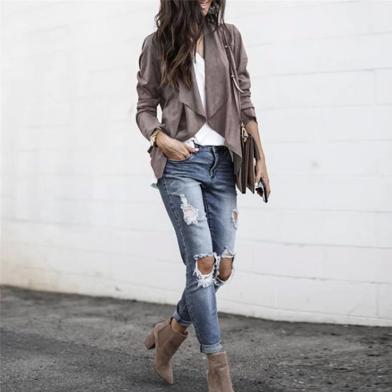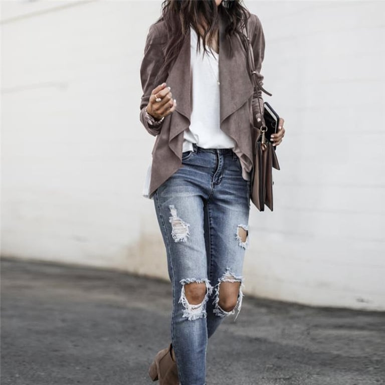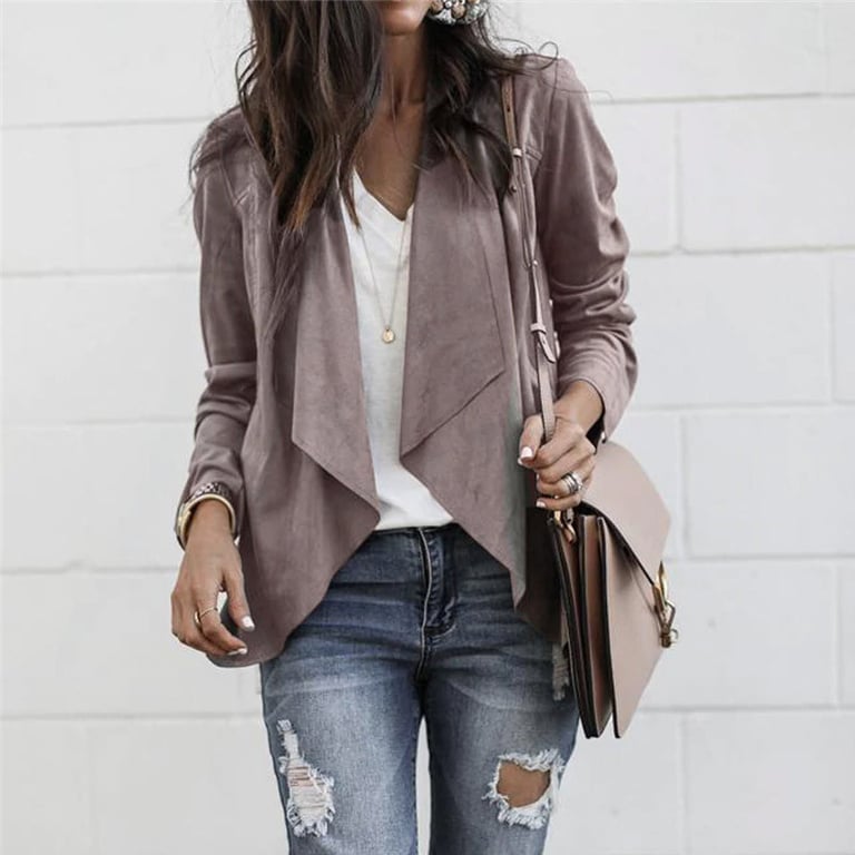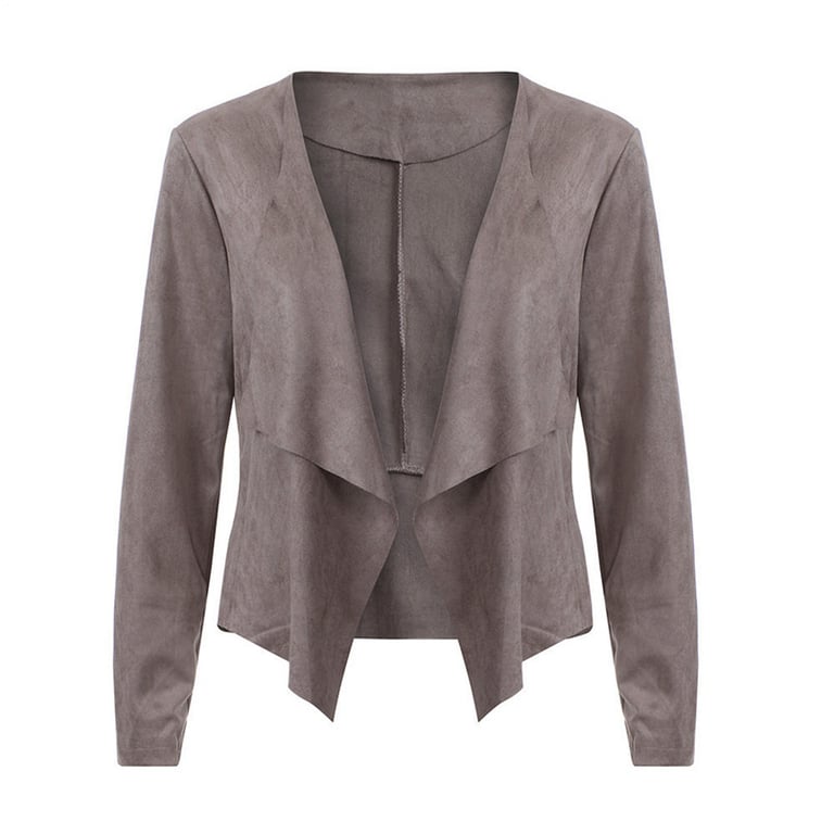 Damenstylische Jacke im Biker-Stil ohne Verschluss. Die Jacke hat einen breiten Kragen und ein Wildleder-Optik. Erhältlich in zwei Farbvarianten.