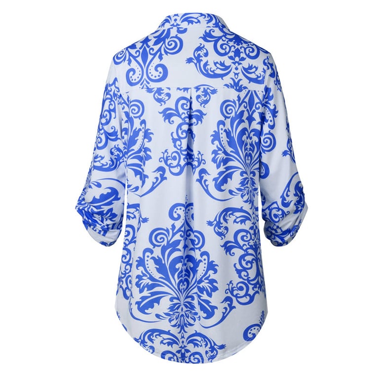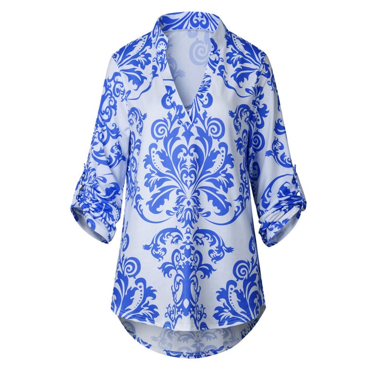 Damenbluse mit einfarbigem Blumenmuster. Die Bluse hat einen V-Ausschnitt mit Kragen und 3/4-Ärmel. Lockere Passform. In mehreren Farbvarianten erhältlich.