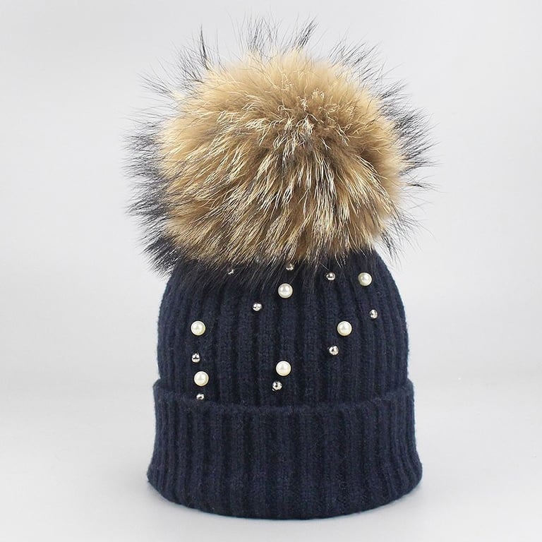 Damen Strickmütze mit Perlenverzierung und großer abnehmbarer Bommel. Erhältlich in verschiedenen Farbvarianten.