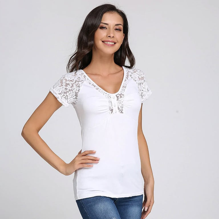 Damen T-Shirt/Top mit kurzen Ärmeln. Das Shirt hat einen V-Ausschnitt mit Knopfverschluss. Der Ärmel ist mit Spitze verziert. Erhältlich in mehreren Farben.