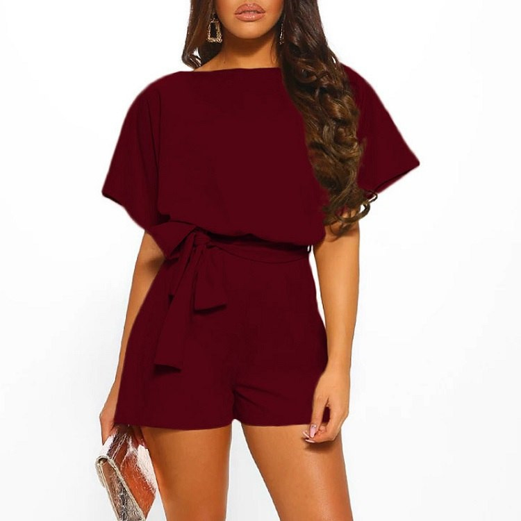Damen eleganter Overall mit kurzen Beinen und kurzen Ärmeln. Lockere Passform mit einem Bindegürtel in der Taille. Erhältlich in mehreren Farben.