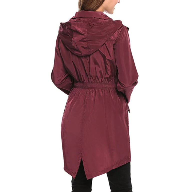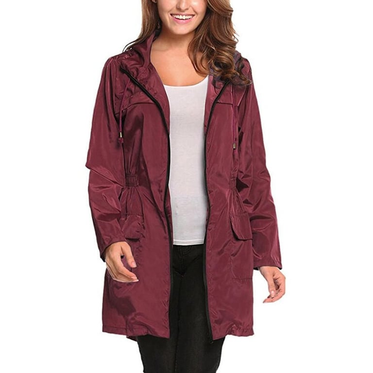 Damen wasserdichte Parka mit Kapuze und Kragen. Längerer, lockerer Schnitt mit Gummizug in der Taille. Reißverschluss. Seitentaschen. Mehrere Farbvarianten.