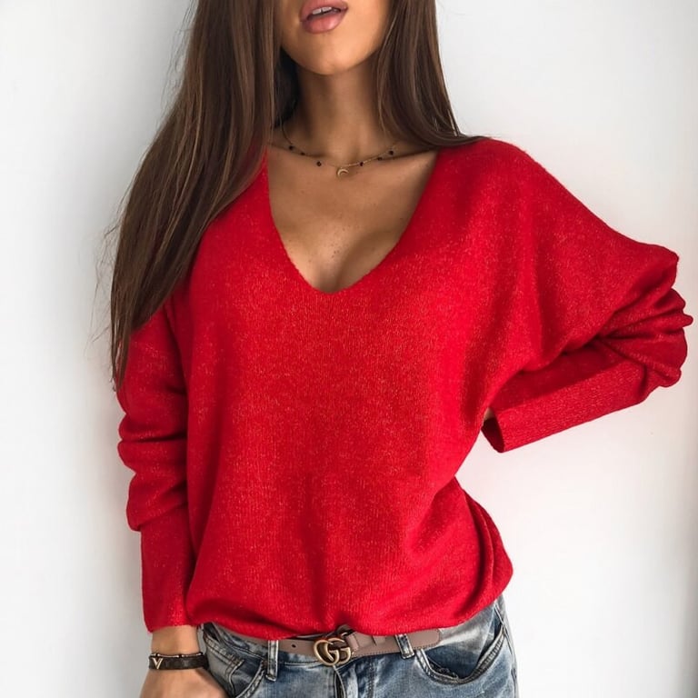 Damenfeiner Pullover mit tiefem V-Ausschnitt. Lockere, bequeme Passform mit langen Ärmeln. In mehreren Farbvarianten erhältlich.