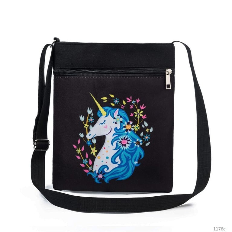 Damentasche mit langem, verstellbarem Schulterriemen. Großes geräumiges Fach und eine kleinere vordere Tasche mit Reißverschluss. Mit buntem Druck.