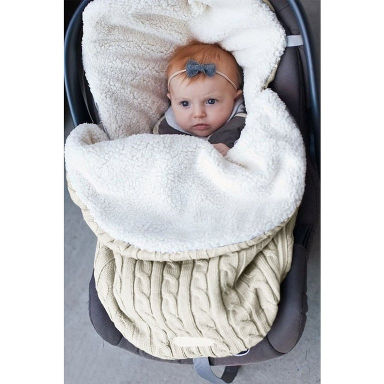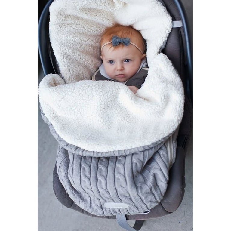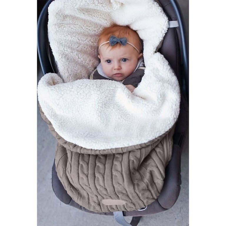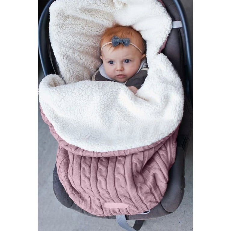 Wärmender Schlafsack für Babys im Kinderwagen und Autositz. Strickoptik. Gefüttertes Plüschinnere. Geeignet für Babys von 0 bis 18 Monaten. In mehreren Farbvarianten erhältlich.
