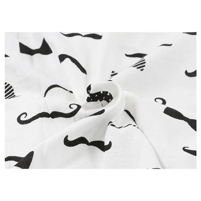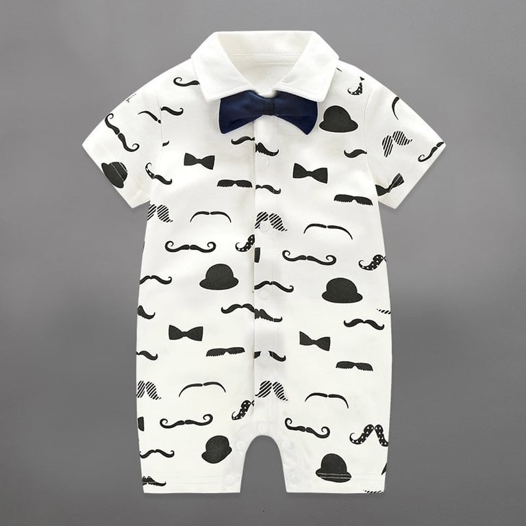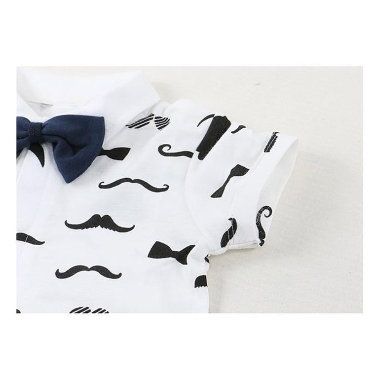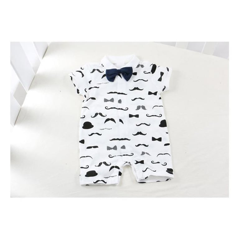 Origineller Kinder-Overall mit kurzen Ärmeln. Mit Knöpfen zu schließen. Weiß mit einem Motiv von schwarzen Schnurrbärten und einer Fliege.