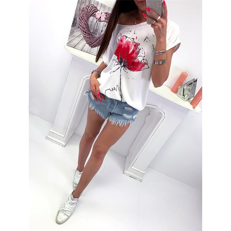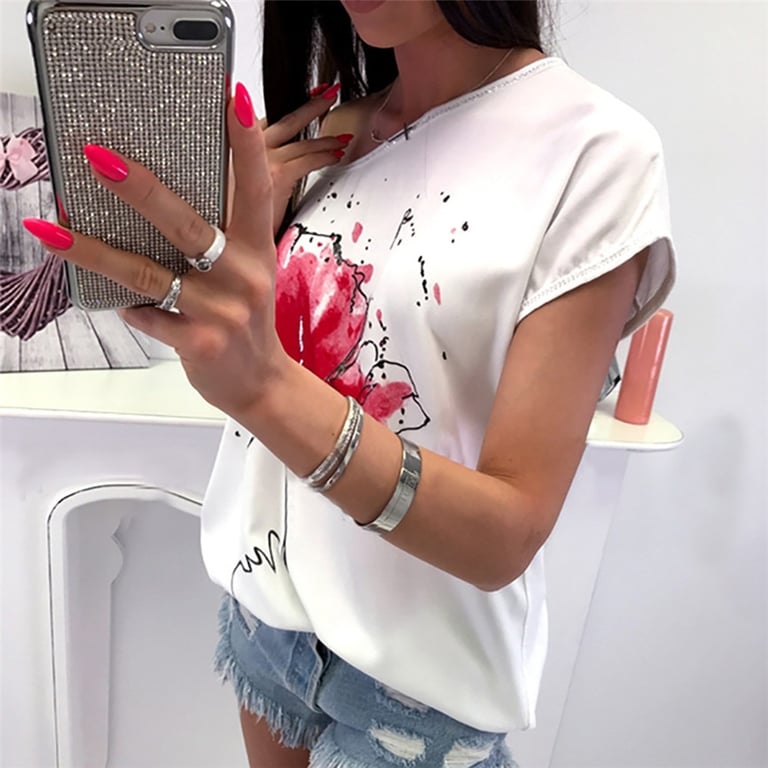 Damen-T-Shirt mit kurzen Ärmeln und hochwertigem Druck auf der Brust.