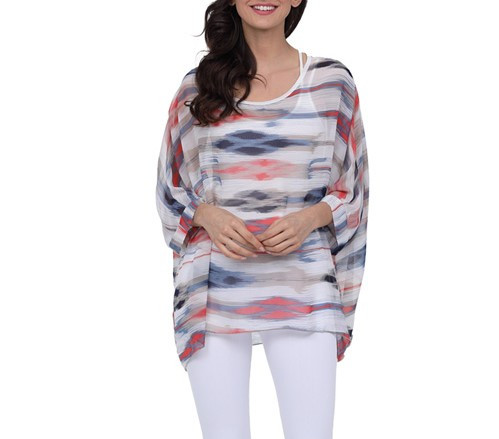 Damenbluse in Übergrößen. Weiße Farbe mit bunten Streifen.