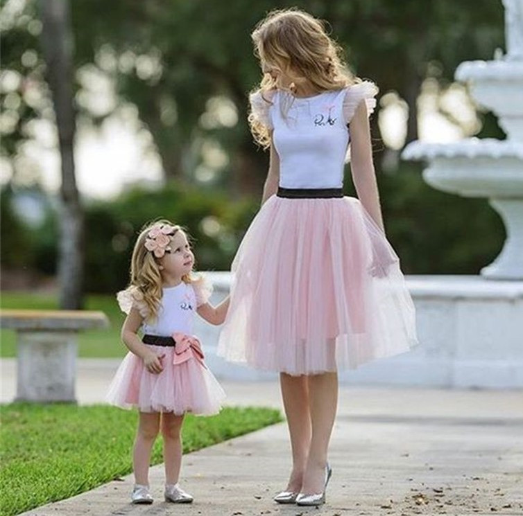 Das gleiche Outfit für Mama und Tochter. Tüllrock in Rosa und weißes T-Shirt mit rosa Ärmeln.
