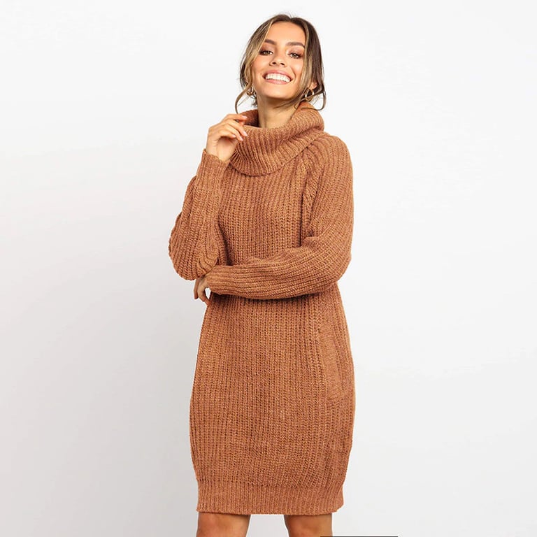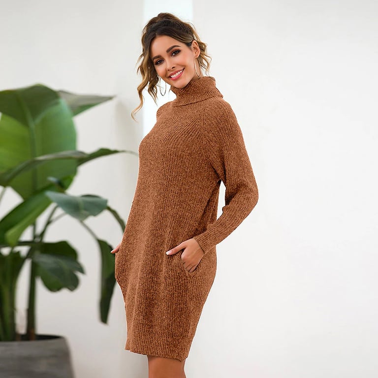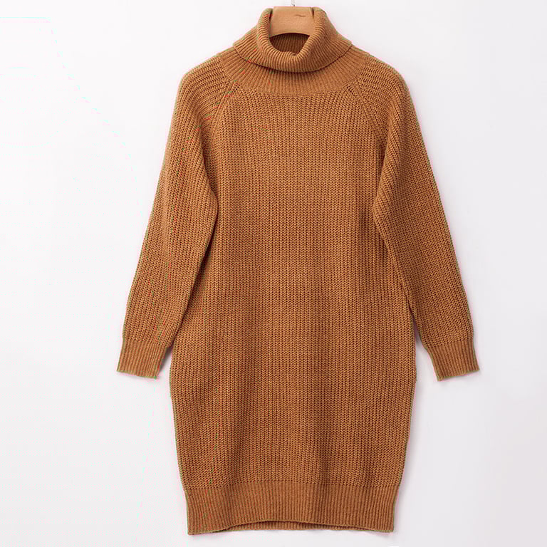 Herbst- und Wintermodell von gestrickten Kleidern für einen stilvollen Look. Der knielange Schnitt passt gut zu einem Wintermantel.